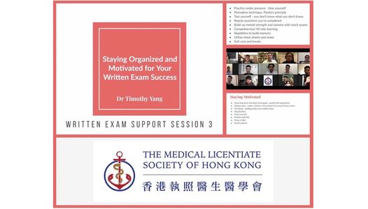 This virtual event was titled "Staying organized and motivated for your written exam success." Thank you to Dr Timothy Yang, who returned for the 2nd part of his presentation in May.